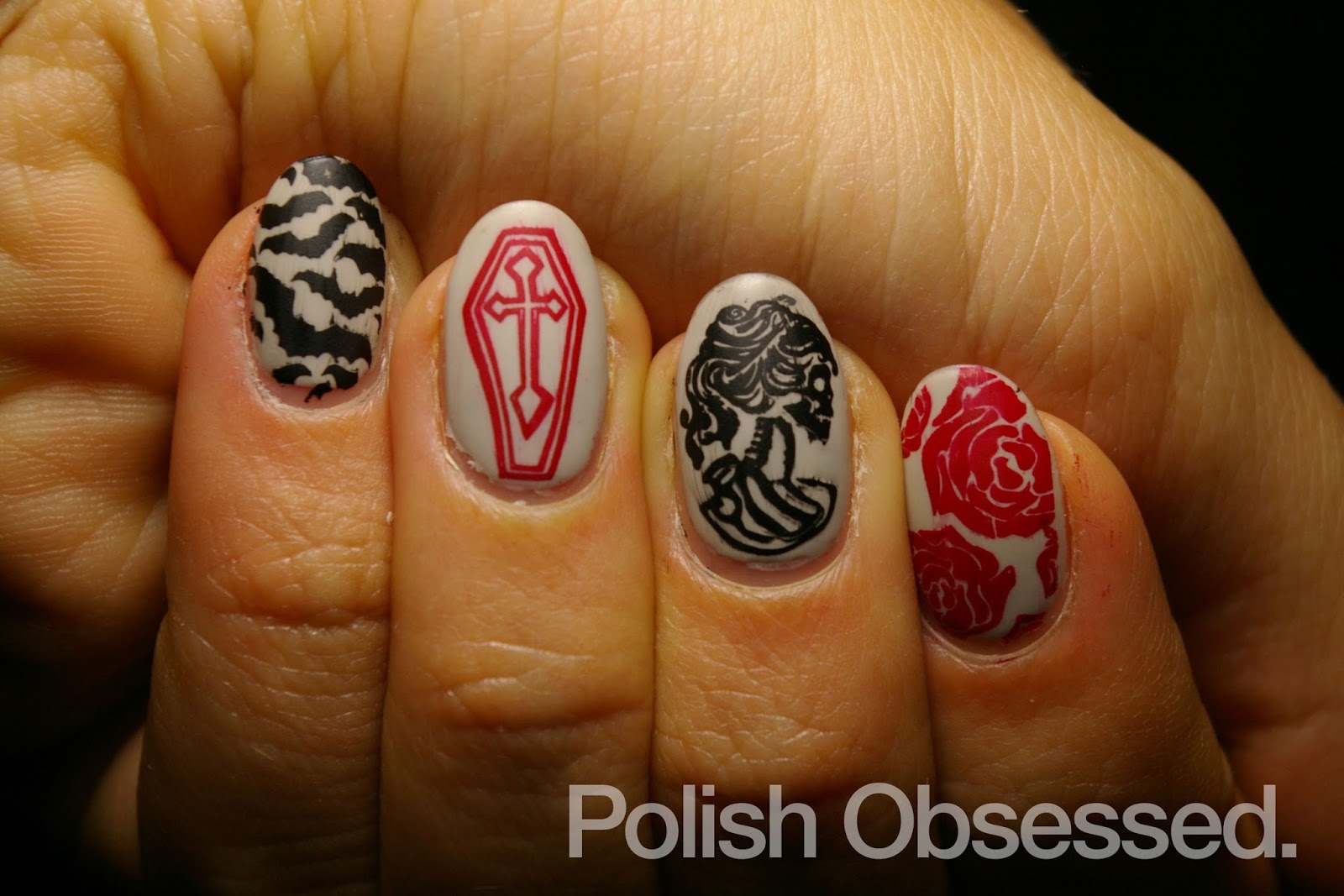 I wasn't quite sure at this point what I was going to do with them, but once I started stamping with the black and red polishes and I took another look through my plates I knew I wanted some full nail patterns that matched the theme. I chose the full nail bats pattern (plate BM-H08) for my pinky and large roses (plate BM-323) for my pointer finger. I defiantly want to do something more complex with the roses and the skeleton profile in the near future!